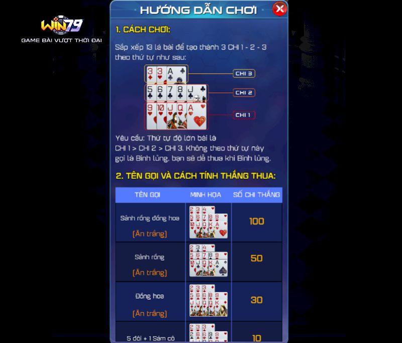 Mậu Binh hay còn gọi là Thập Tam hoặc tại nhiều nơi là Xập Xám, đòi hỏi tư duy logic và sự nhạy bén trong sắp xếp bài. Người chơi cần khéo léo phân tích từng quân để có thể giành chiến thắng, bởi trò này ngoài việc dựa vào may mắn mà còn yêu cầu chiến lược cao.Trong trò chơi này, mỗi người sẽ được chia 13 quân và sắp xếp chúng thành 3 chi khác nhau. Hai hàng đầu, mỗi chi có 5 lá, chi cuối cùng chỉ có 3 lá. Quy tắc chính là chi trước phải mạnh hơn chi sau, và các quân phải được kết hợp sao cho đúng quy định.Nếu may mắn sở hữu tay bài đặc biệt như “sảnh rồng” (13 lá từ 2 đến A liên tiếp) hoặc 13 lá cùng một chất, cược thủ sẽ thắng trắng mà không cần đối đầu với bất kỳ ai khác. Đây là một trường hợp hiếm nhưng cũng vô cùng thú vị trong dòng game này.Nắm rõ những thuật ngữ quan trọng khi chơi mậu binh Win79